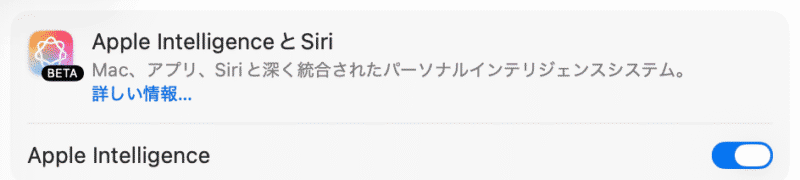 システム設定から「Apple IntelligenceとSiri」をクリックし、「Apple Intelligence」のトグルをオンにすることで各機能が利用可能になります。